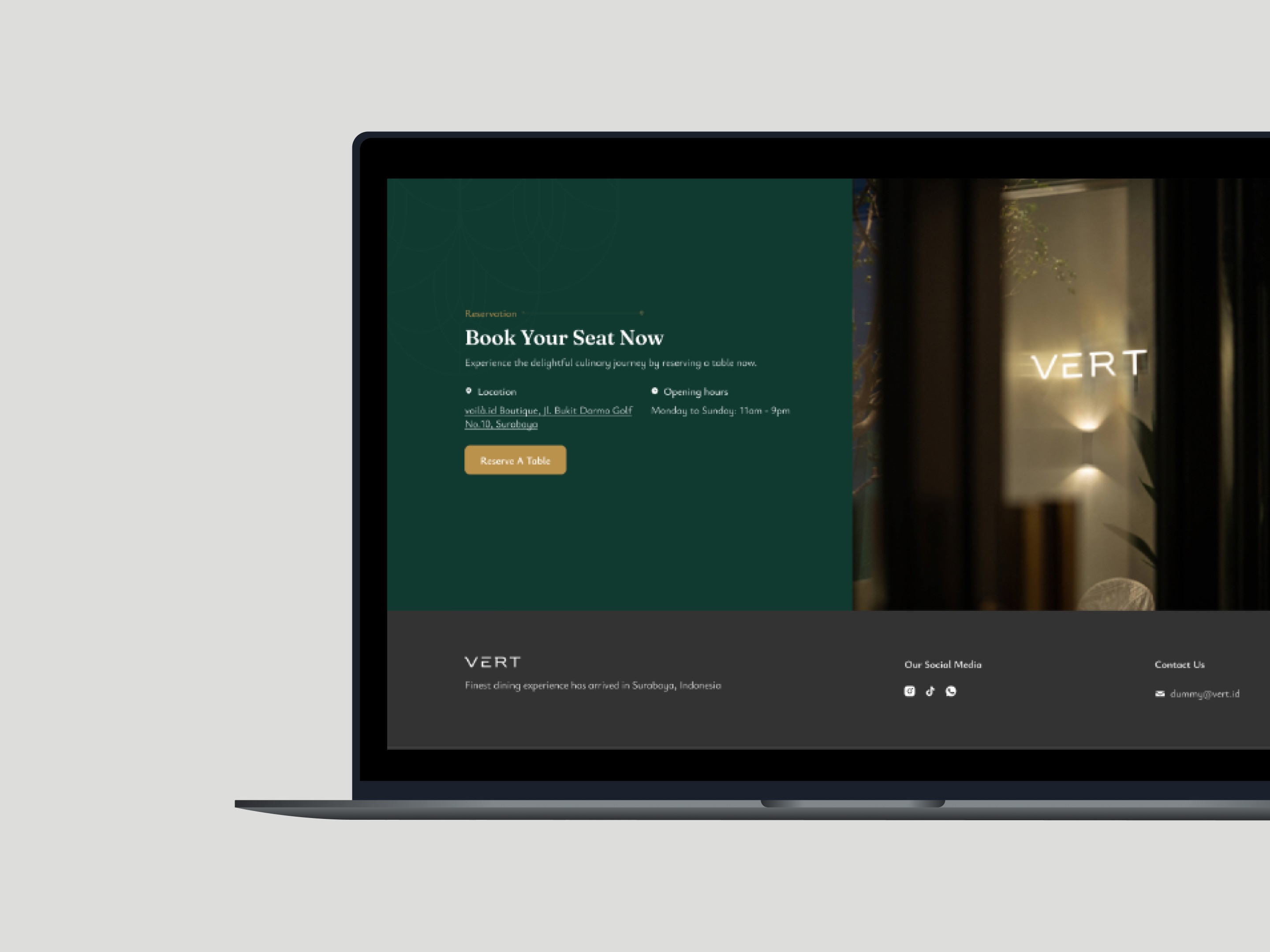 Vert.ID is a luxury restaurant introduced by Voilà.ID, offering an exceptional dining experience with a refined ambiance and world-class service. The landing page highlights the elegance of Vert.ID, showcasing its luxurious interior design, curated menu of exquisite dishes, and exclusive reservation system. Additionally, the page provides essential information, such as the restaurant's location, operating hours, and contact details, ensuring an effortless dining journey for its patrons. Vert.ID combines culinary artistry and sophistication, making it the perfect destination for memorable dining experiences.